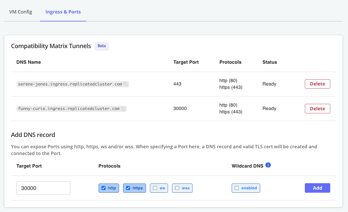 • Compatibility Matrix VMs: The Admin Console domain is the hostname for the DNS record with port 30000 that you added to the VM. You can find this hostname by going to Compatibility Matrix > Edit VM in the Vendor Portal.